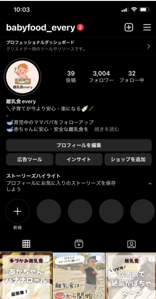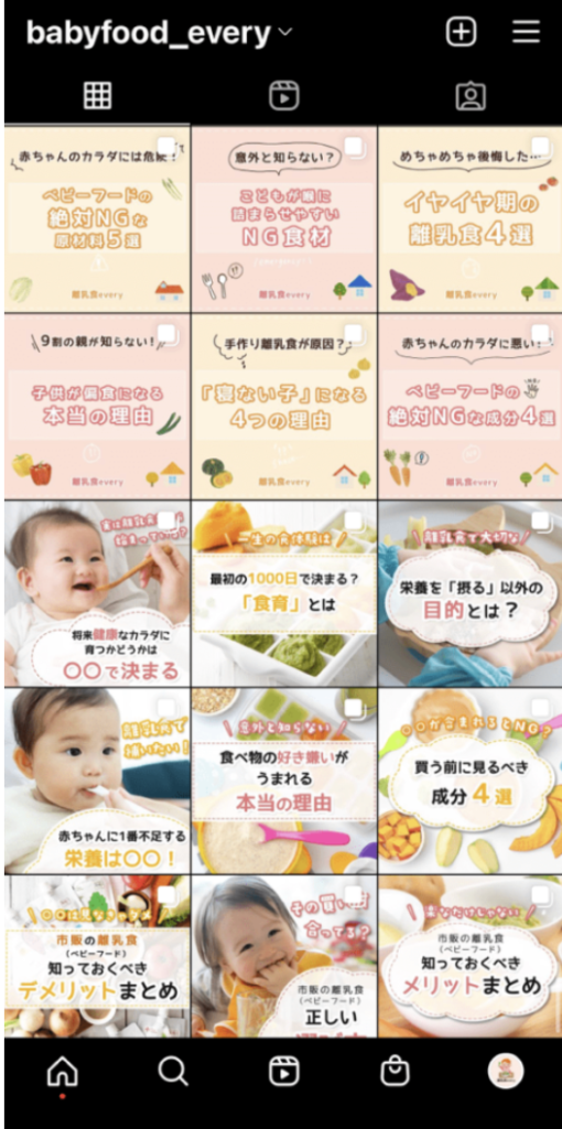 例えば、以下のメディアアカウントは「離乳食」に関する情報を扱っており、プロフィールに「離乳食」と書かれているだけではなく、投稿の内容も離乳食にまつわるコンテンツのみで更新されています。