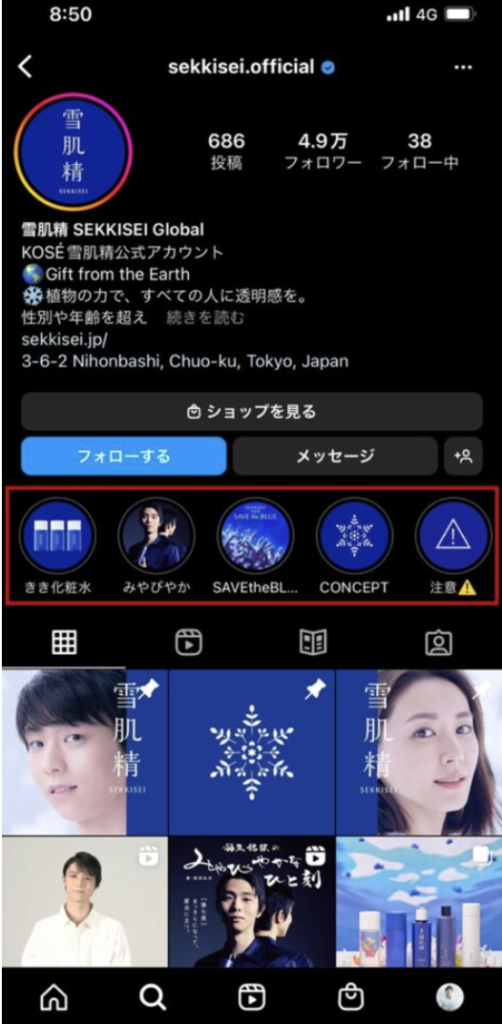 ストーリーズは24時間で消えるため、限定的なプロモーションを行う際の集客口として有効です。ハイライトから購入導線は直接的なセールスであるのに対して、ストーリーズの場合は売り込み感の薄いセールスが可能です。