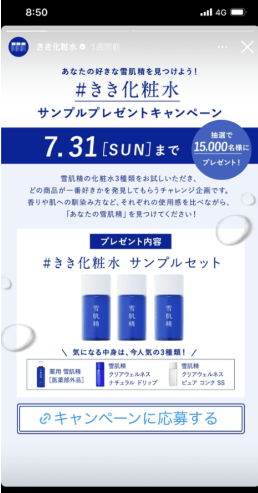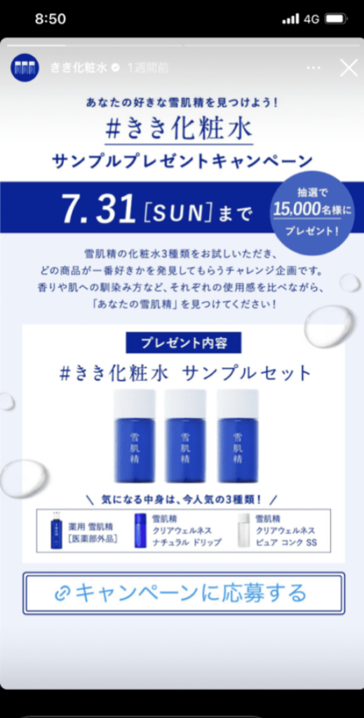 上記の例はキャンペーン情報のため直接的ですが、例えば、質問募集の回答をシェアする形でサービスの紹介を織り込んだり、投稿とは違った見せ方ができるのがストーリーズでの告知です。