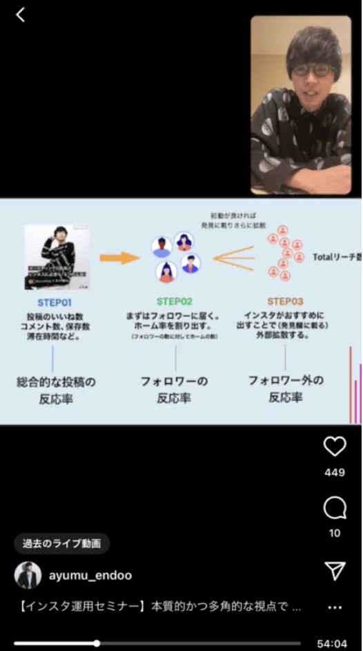 ちなみにストーリーズの閲覧率は15%以下だと低いとされ、20%以上になると内部エンゲージメントは高いと考えられています。内部エンゲージメントを高めるためには、日ごろからフォロワーとのコミュニケーション(交流)が大切になります。