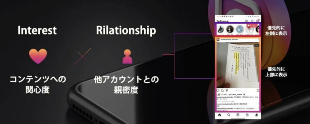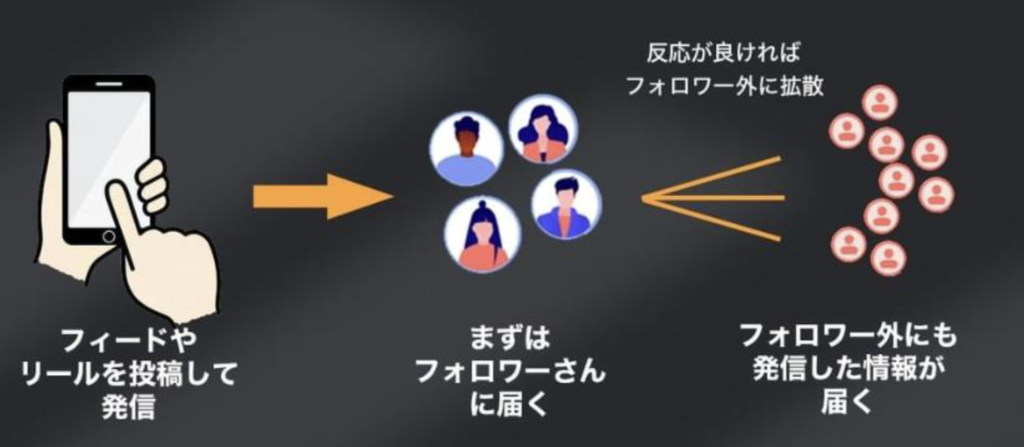 エンゲージメントとは、フォロワーとの親密度を表す指標です。インスタはフォロワー(内部)からフォロワー以外(外部)へとリーチが広がっていく仕組みのため、内部エンゲージメントが高ければ高いほど投稿が発見欄などの外部に露出しやすくなり、フォロワー以外へのリーチが増えていきます。