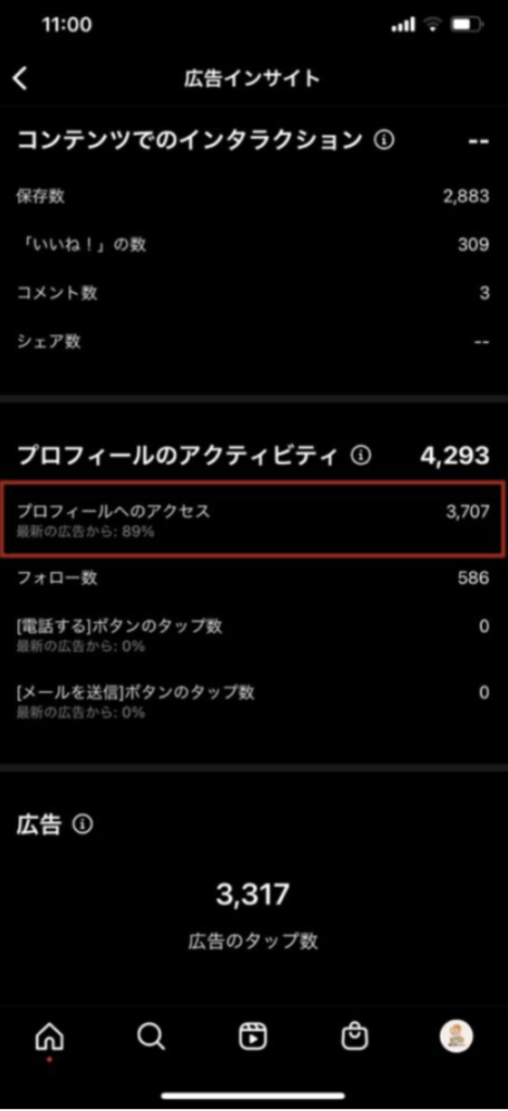 例えば、リーチ数が100回あるのにプロフィールアクセス数は5回だった場合、プロフィールアクセス率は5%になります。リーチ数は多いが、プロフィールアクセス率は低い状態です。