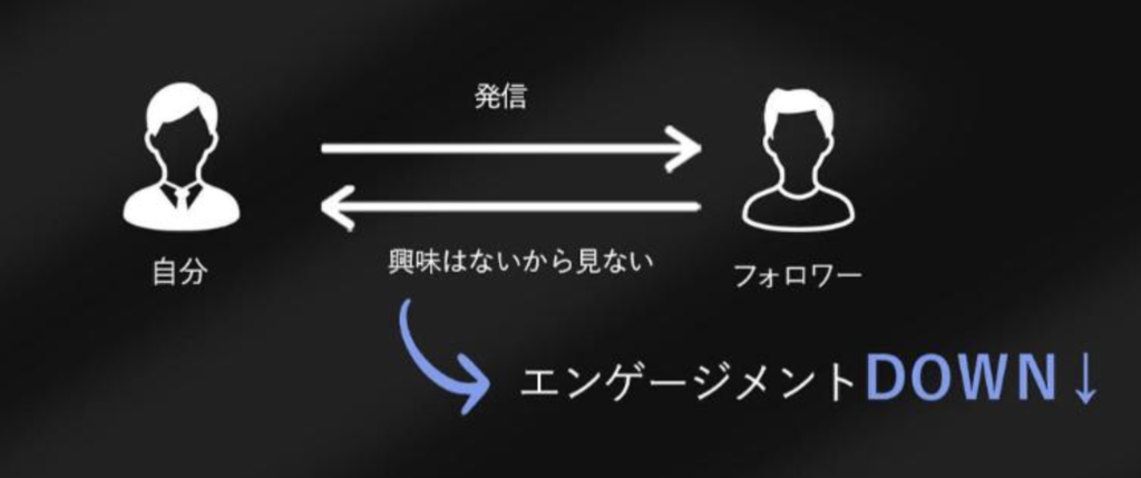 フォロワーは自身のアカウントに興味をもった、いわば顕在顧客に転換する潜在層ですが、「何に興味をもってフォローしたか?」がずれてしまうと、本来ターゲットとするアカウントではないユーザーからのフォローばかりが増えます。はじめから属性が違うため、どれだけエンゲージメントを高めようとしても顕在顧客には転換しません。