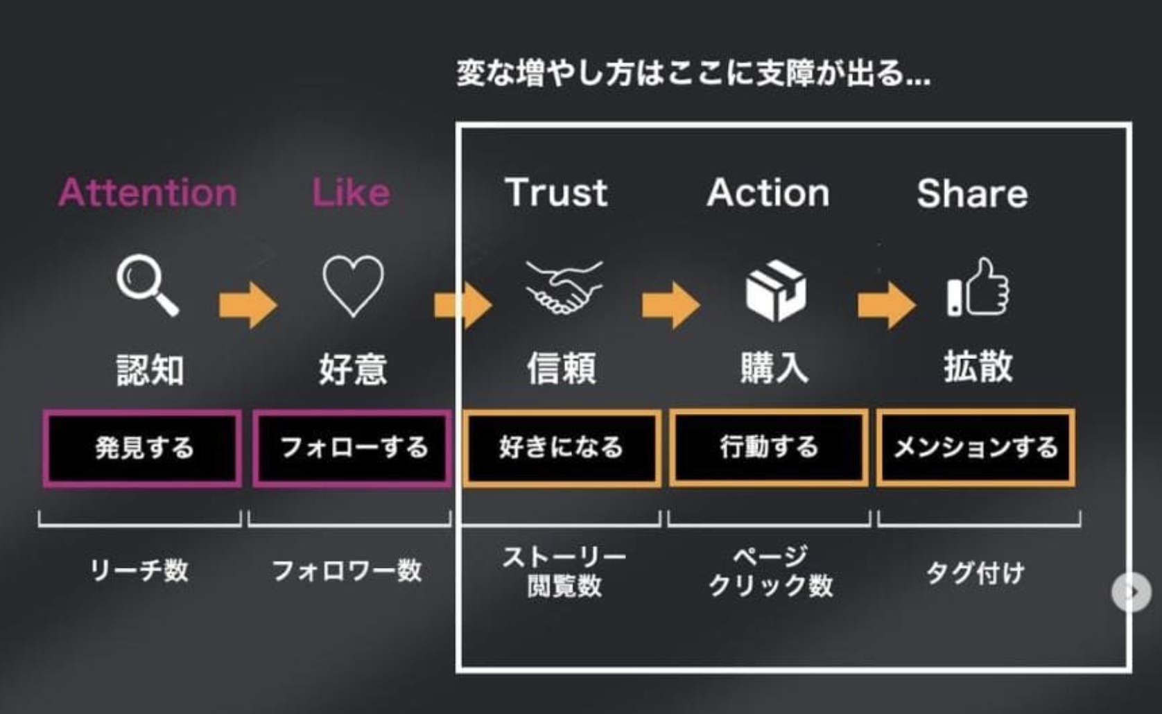多くのインスタ運用者は、このフォロー数を増やすために四苦八苦していることでしょう。当然ながら、一定のフォロワーがいないと顕在顧客に転換すべきπがそもそも存在しないため、フォロワー数を増やすことはインスタ運用の大命題です。