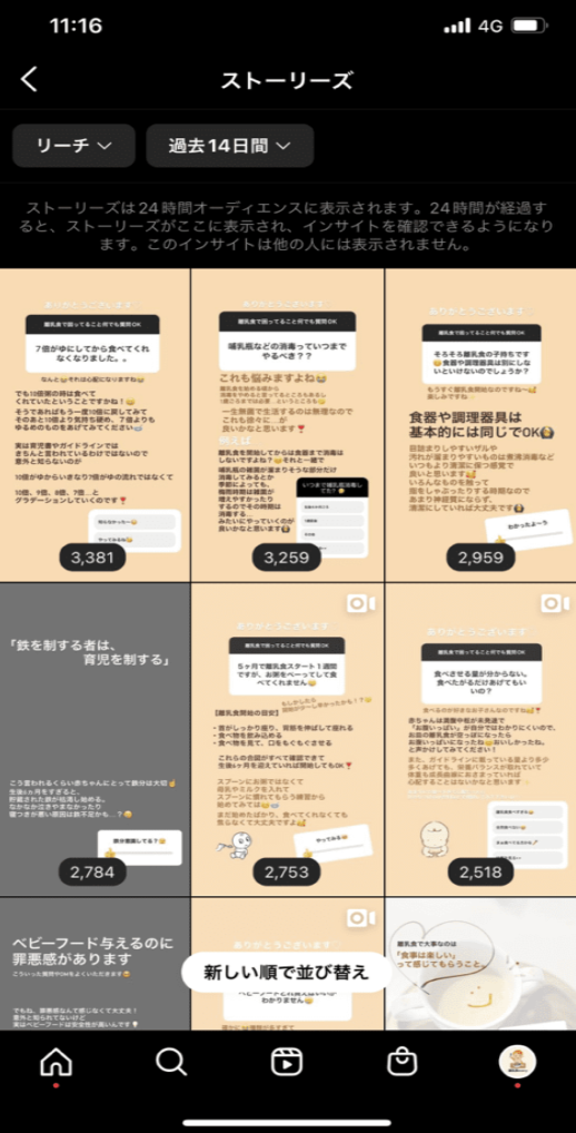 エンゲージメントを測る指標として、ストーリーズの閲覧数があります。ストーリーズは基本的にフォロワーが閲覧するため、純粋に「フォロワー内でどれだけ投稿が見られているか?」を確認できるためです。