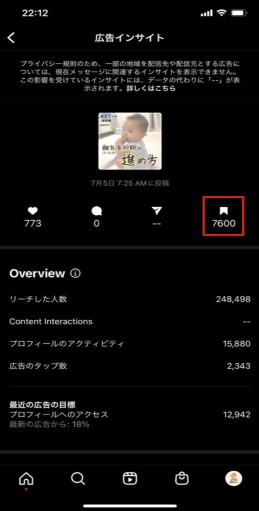 保存数とは、各投稿における保存マークが押された数です。「保存して後から見返しやすくする」ためにユーザーが行うアクションであり、保存した投稿は、メニュー内の「保存済み」にアーカイブされ、いつでも見返すことが可能になります。