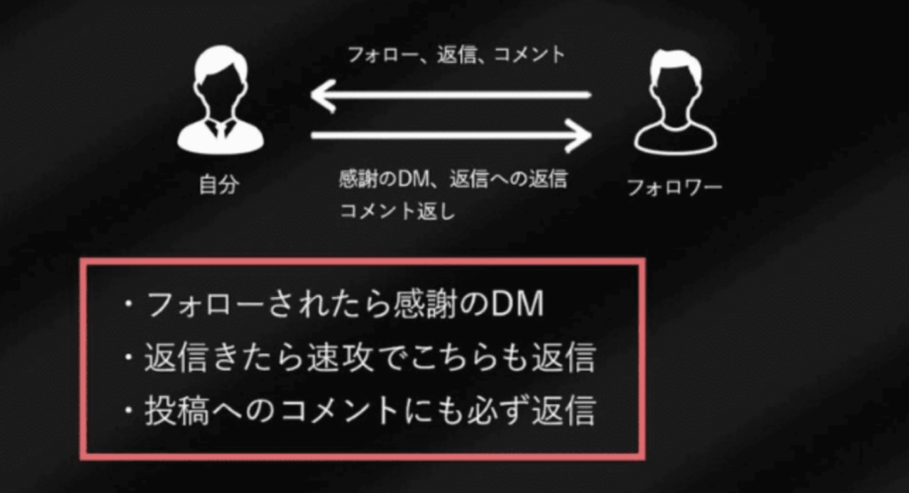 フォロワーとコミュニケーションとることも有効です。例えばDMでフォロワーと交流する等。