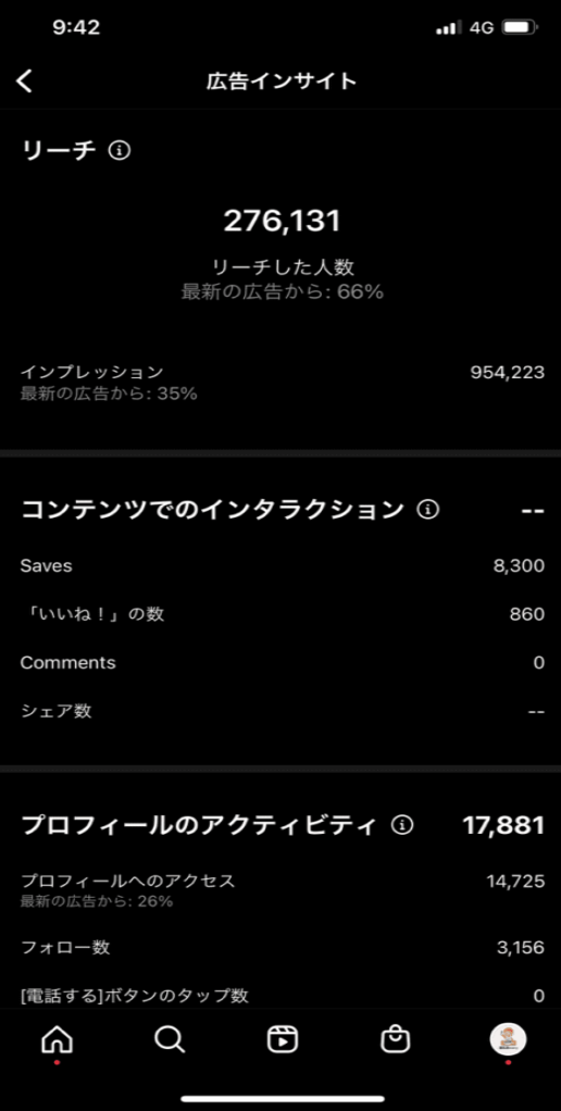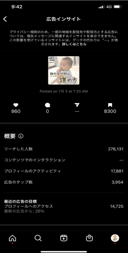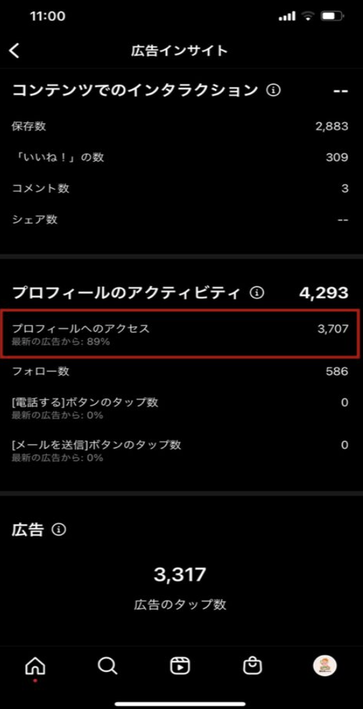 例えば、リーチ数が100回あるのにプロフィールアクセス数は5回だった場合、プロフィールアクセス率は5%になります。リーチ数は多いが、プロフィールアクセス率は低い状態です。