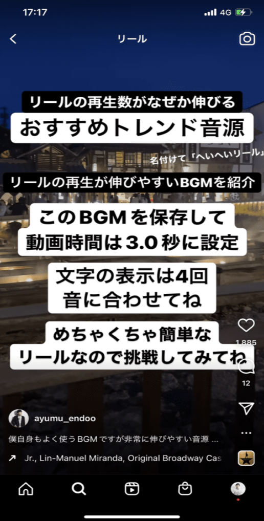 また、リールは再生数と再生完了率が重要な指標になります。再生しないと内容がわからないリールは伸びません。加えて、開始3秒で「続きを見たい」と思われる構成や仕掛けが無いと、すぐに離脱されてしまいます。