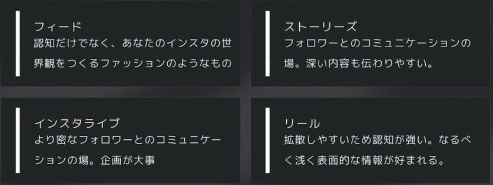 また、ただ投稿を続けるのではなく、リールやストーリーズなど、各コンテンツを役割に沿って適材適所で活用し“総合的な運用”もしていかなければいけません。