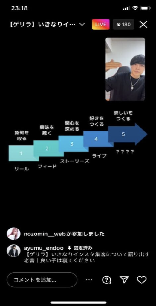 インスタライブの視聴者数は、集客フェーズにおける重要な指標になります。リアルタイムで配信されるライブを視聴するユーザーはファンもしくはファンになり可能性が高く、“インスタライブで何人を集められるか?”がアカウントの集客効果を測る最もわかりやすい数字ともいえます。