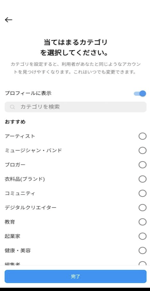 カテゴリーはアカウントの属性に合うもの、または近いものを選択しましょう。ちなみに「プロフィールに表示」をオフにすると、プロフィール画像直下にカテゴリーは表示されません。