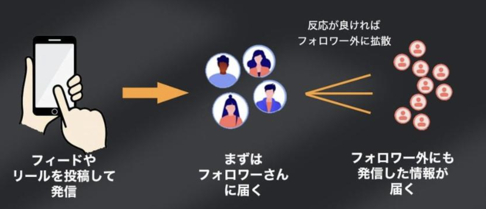 エンゲージメントとは、フォロワーとの親密度を表す指標です。インスタはフォロワー(内部)からフォロワー以外(外部)へとリーチが広がっていく仕組みのため、内部エンゲージメントが高ければ高いほど投稿が発見欄などの外部に露出しやすくなり、フォロワー以外へのリーチが増えていきます。
