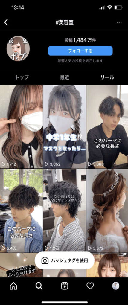 上記の中にリールの検索結果が含まれていませんが、『タグ』のタブから任意のハッシュタグを選び、画面上部の『リール』を選択すれば検索したかったリールの一覧を見ることができます。