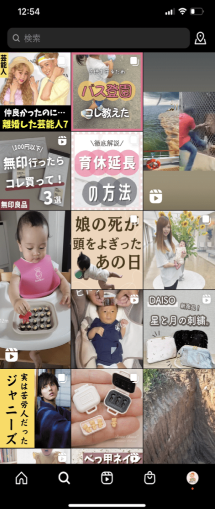 発見タブの欄に表示されるコンテンツは、普段よくみる投稿に近しいものばかりであり、過去にいいねをしたり保存したり、何かしたら自身が興味を示した行動データからレコメンドされたものが並びます。