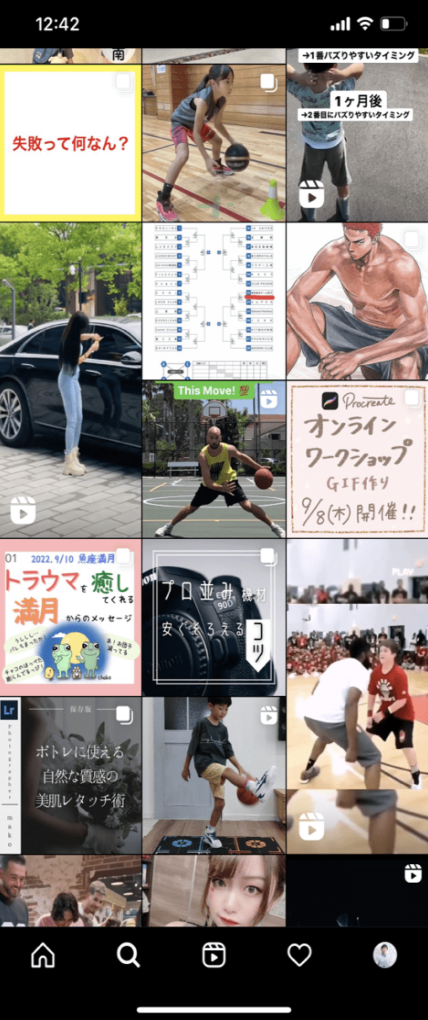 例えば筋トレに興味があるユーザーの発見欄には、筋トレやボディメイク系の投稿が並び、旅行が好きなユーザーには旅系アカウントの投稿や風景の投稿がレコメンドされます。