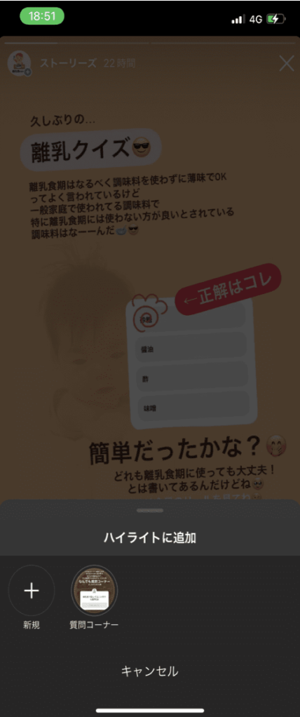 作成済みのハイライトがある場合は、ストーリーズ画面でハイライトを選択すると、新規で作成するか既存のハイライトに追加するか選べます。