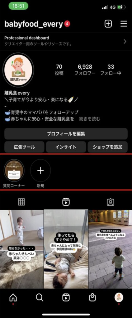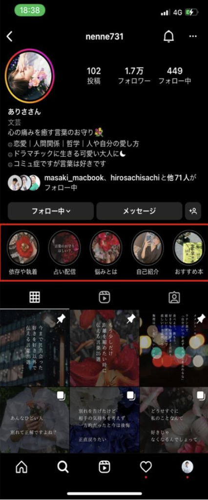 インスタグラムのハイライト機能とは、下図の赤丸で囲ったプロフィール画面の中段に表示されるコンテンツです。