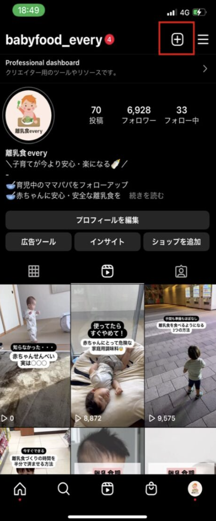 - プロフィール画面右上の+ボタンをタップ