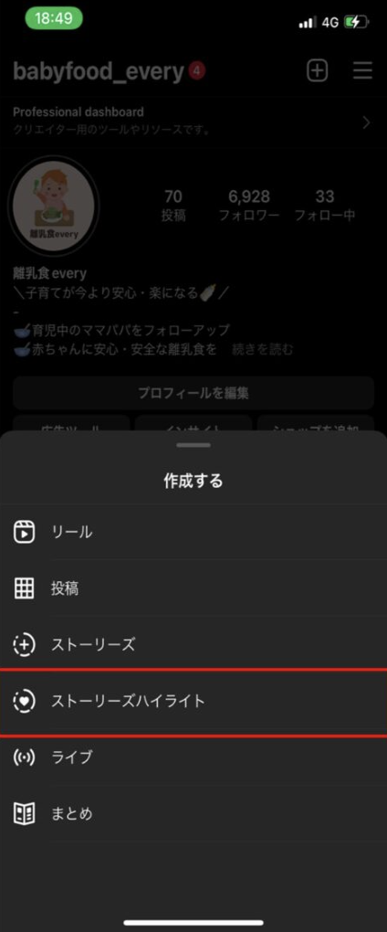 新たに投稿したストーリーズから新規でハイライトを作りたい場合の手順は以下です。