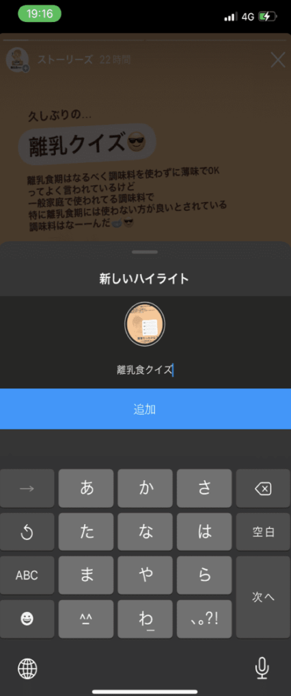 過去のアーカイブから選択して作成するのとは違い、ひとつのストーリーズを選んですぐにハイライトが作成されます、そのため、いくつもアーカイブしてハイライトを整えたい場合は、続いて作成済みのハイライトにストーリーズを追加する必要があります。