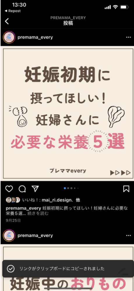 アプリ画面右上のインスタグラムのマークを選択します。すると、インスタグラムのアプリに切り替わりますので、リポストしたい投稿のURLをコピーしましょう。
