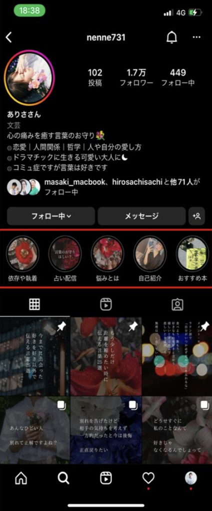 ハイライト機能とは、下図の赤丸で囲ったプロフィール画面の中段に表示されるコンテンツです。
