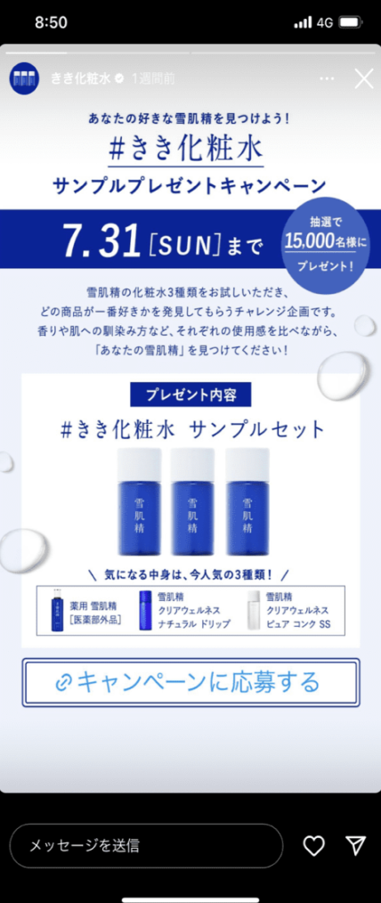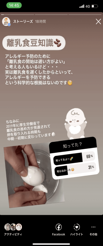 上記の例はキャンペーン情報のため直接的ですが、例えば、質問募集の回答をシェアする形でサービスの紹介を織り込んだり、投稿とは違った見せ方ができるのがストーリーズでの告知です。